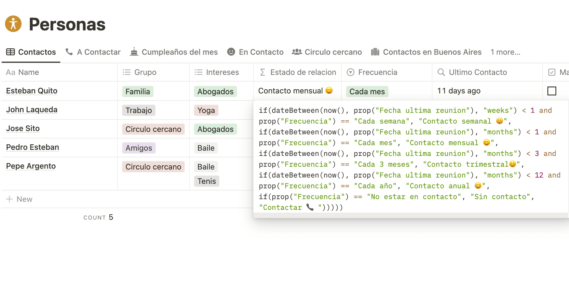 En nuestra planilla hemos hecho una concatenación de ifs para saber si debemos o no contactar a una persona para no perder la relación con ella. Si hemos establecido que debemos estar en contacto semanalmente con dicha persona y no lo hemos hecho, la función IF nos dira que debemos contactarla.