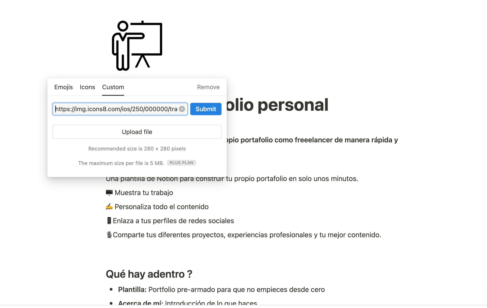 - NotionSimple: tenemos una selección curada de iconos para Notion. Ahi vas a poder buscar en español, filtrarlos por categorias y con un simple copiar y pegar, copiar la url. En la siguiente foto vemos como podemos seleccionar el icono y cambiarlo en nuestra plantilla de Portfolio personal
