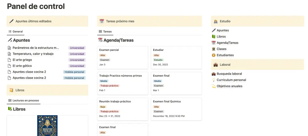 1) Notion Estudiantes: Plantilla en castellano creada por Notion Simple con un panel de control integrado donde podemos ayudar en los siguientes temas: