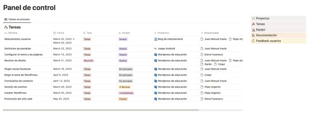 Acaba de salir del horno nuestra plantilla de gestión de proyectos. Nuestro enfoque es para ayudar a la planificación del trabajo un equipo de no más de 10 personas. El ejemplo que hicimos es para una pequeña pyme de 8 personas que tiene 2 lideres de proyectos y manejan 3/4 proyectos en paralelo. Allí se podrá manejar las tareas y responsabilidades de cada persona, así como también el feedback de los usuarios de los proyectos. Cuenta con mas de 5 bases de datos para proyectos, tareas, equipo, feedback y documentación.
